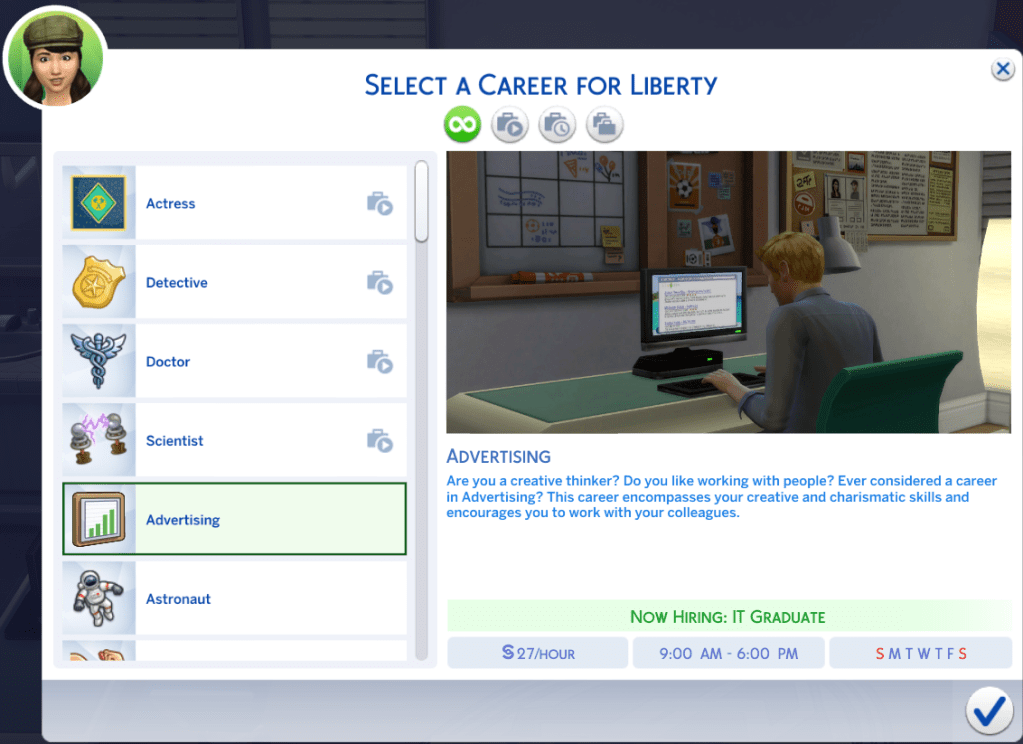 The career has 10 levels and no additional branching. There are 6 work from home assignments available should you wish to use them and there are no daily tasks or uniforms. The Advertising career doesn’t require any university degree to join but will require a Communication degree to progress beyond Level 5.