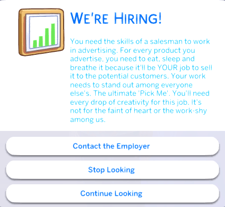 There’s a separate package available if you also use Zer0’s Job Finding Mod. The addon package makes the Advertising Career compatible with that mod, so you Sims can go to a job interview.