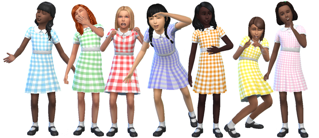 The set contains 7 recolours of the Cats & Dogs dress for sim-children. It’s a standalone item in the catalogue and is tagged for Everyday and Hot Weather (if you have Seasons). The dresses are in blue, green, red, lilac, orange, yellow and pink gingham patterns and make ideal summer dresses!