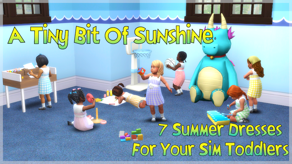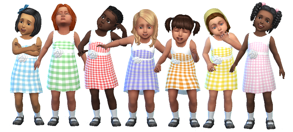 The set contains 7 recolours of the Toddler Stuff dress for toddlers (well, of course). It’s a standalone item in the catalogue and is tagged for Everyday and Hot Weather (if you have Seasons). The dresses are in blue, green, red, lilac, orange, yellow and pink gingham patterns and make ideal summer dresses!