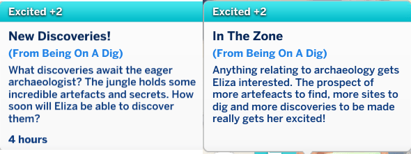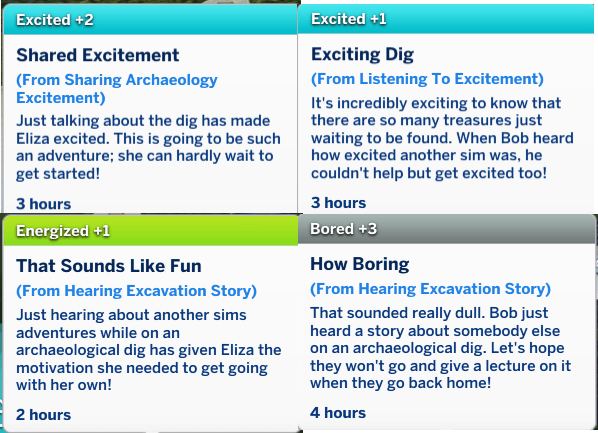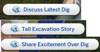 There are also 3 Social Interactions available for your sims while they’re on the lot. The ‘Share Excitement Over Dig’ and ‘Tell Excavation Story’ both have custom buffs available.