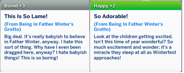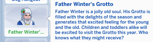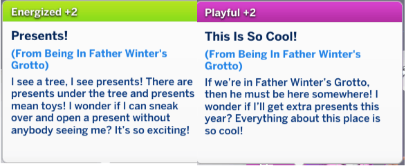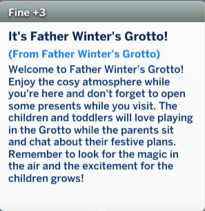 There are a small handful of different buffs your sims can get on a lot with this trait. Everyone gets the “It’s Father Winter’s Grotto!” buff, which boosts the ‘Fine’ emotion.
