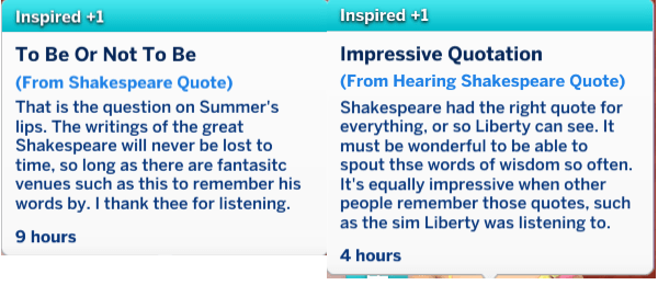 While on a lot with the trait, Sims will generate Whims relating to the Acting skill, if Get Famous is installed.
