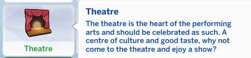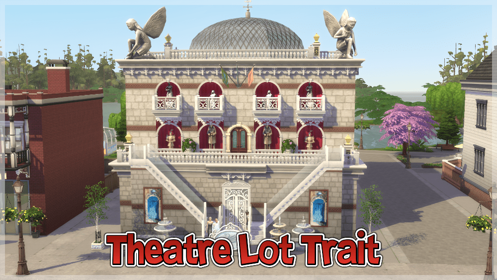 In my game, I have an opera house for my philharmonic society and my actors to rehearse and perform in. There was always something missing and so I’ve created a Theatre lot trait.