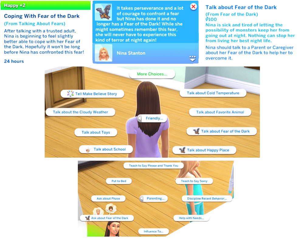 With each interaction, the toddler/child will gain a moodlet for Coping With Fear. This comes in varying strengths, depending on how well a child is doing with coping. The more they talk to a parent of caregiver, the better they do until eventually, they resolve the fear.